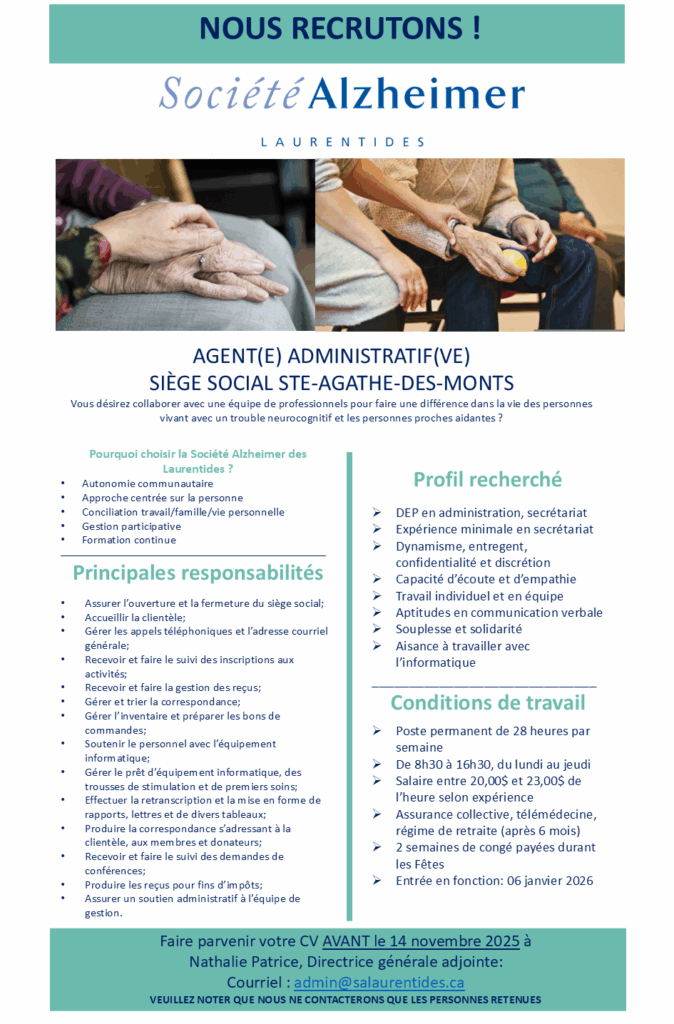 La Société Alzheimer Laurentides affirme sa volonté d`être reconnue comme une organisation pertinente, performante et innovante, qui se distingue par son approche humaniste.